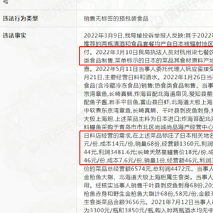 处罚事由显示,今年3月,执法人员接到举报人反映,其于2022年2月26日在杭州市里鸡笼山7号杭州柒七餐饮管理有限公司就餐,店内推荐的两瓶清酒和食品均产自日本核辐射地区,且两瓶清酒无中文标签,消费金额18760元。