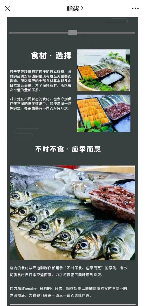 其中,长崎真鲷、富山县白虾等菜品主料为日本进口。而北海道扇贝、爱知县星鳗苗、爱知县鳗鱼蒲烧、长崎天然星鳗,这几道菜品中的主料鳗鱼采购于青岛市市北区尚诚尚品海产经营中心,扇贝采购于杭州农贸市场。