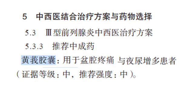 在Ⅲ型前列腺炎中西医治疗方案的“中医辨证论治与方药选择”推荐版块中,金前列康黄莪胶囊成功纳入,并成为治疗“盆腔疼痛和夜尿增多患者”推荐用药,这也是黄莪胶囊首次纳入的前列腺炎诊疗专家共识。
