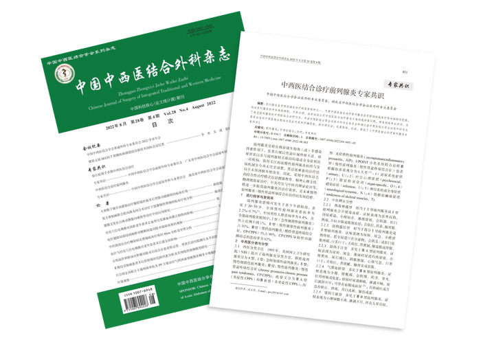 2022 年 8 月,由中国中西医结合学会泌尿外科专业委员会和湖北省中西医结合学会泌尿外科专业委员会联合组织的中西医结合感染与炎症专家共识编写组,历时两年,反复修改论证,撰写的《中西医结合诊疗前列腺炎专家共识》正式发布于权威期刊《中国中西医结合外科杂志》2022 年 8 月第 28 卷第 4 期。
