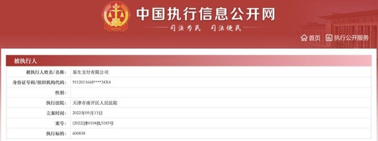 日前,中国执行信息公开网显示,易生支付有限公司(下称“易生支付”)被列入被执行人名录,执行标的为60.08万元,执行法院为天津市南开区人民法院,立案时间为2022年9月13日。目前中国裁判文书网未显示具体关联案件。