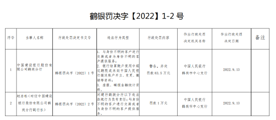 建设银行鹤岗分行被罚83.5万 因虚报、瞒报金融统计资料等
