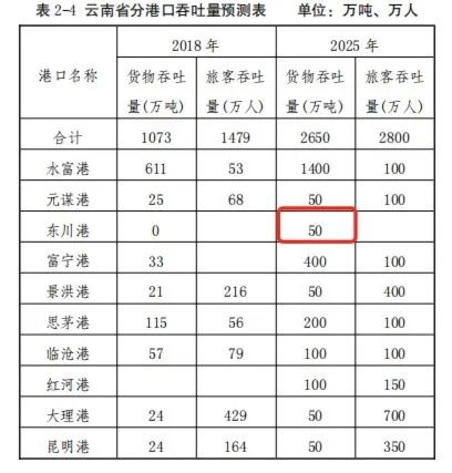 东川港建设项目可行性研究报告预测,东川港一期建成后,进出港的主要货类有金属及非金属矿石、矿建材料、煤炭等,到2025年货运吞吐量预计达174万吨。这一数值在云南省水运发展“十四五”规划中,仅为50万吨。