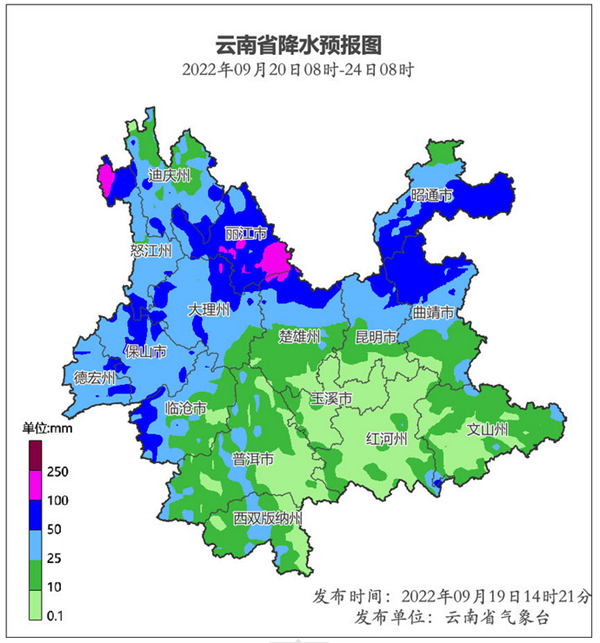 9月21日:昭通、曲靖北部、昆明北部、楚雄北部、丽江、大理北部、迪庆南部、怒江北部阴天间多云有中雨局部大雨。