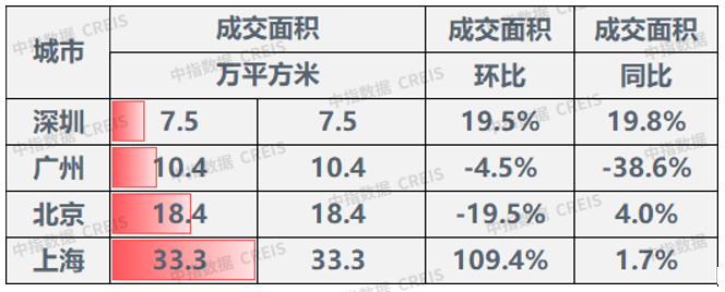 ▌一线城市:整体成交面积环比上涨,上海、深圳成交面积环比上涨幅度较大