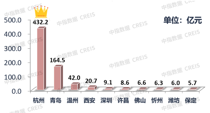 榜单总额环比上涨,门槛降至5.7亿元,入榜城市分布较为均匀,杭州收金逾432亿居榜单首位。