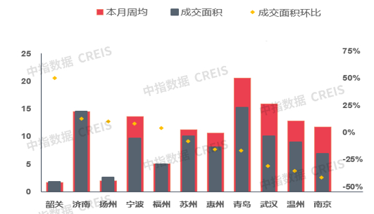 ▌二三线城市:总体成交面积同比、环比均下降,济南、宁波、福州等成交面积环比上涨