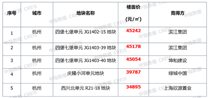 ▌宅地单价TOP5:榜单均价环比上涨,杭州上城区宅地领衔
