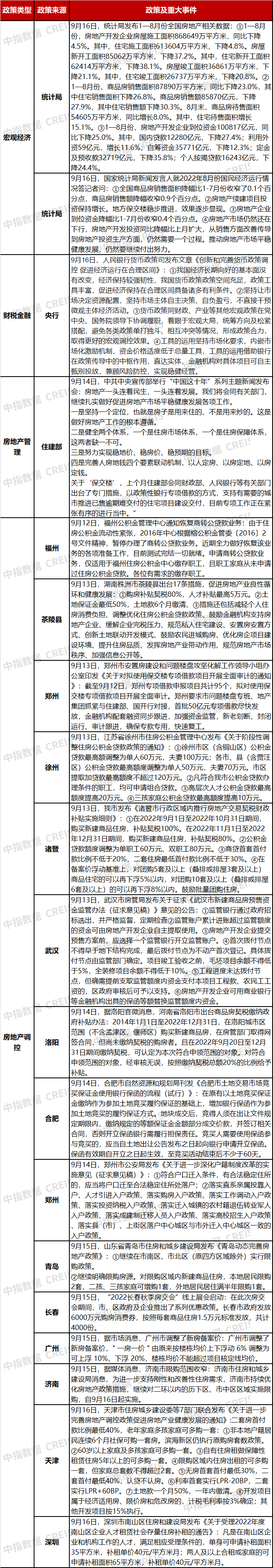 表:9月12日至9月18日房地产市场重点政策及事件汇总