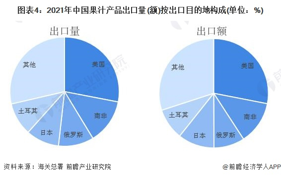 其中,我国出口至美国的果汁的数量为13.62万吨,约占总出口量的28.03%;出口金额为1.49亿美元,约占出口总金额的28.06%。出口至南非的果汁的数量为6.46万吨,约占总出口量的13.29%;出口金额为6786.58万美元,约占出口总金额的12.76%。