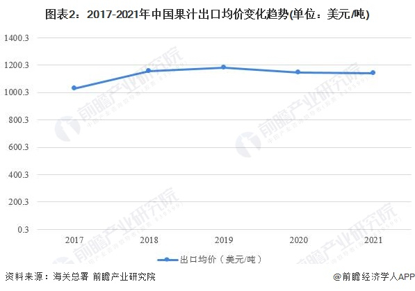 从出口均价走势来看,近年来,我国果汁产品出口均价基本维持在1100美元/吨左右。到2021年,全国果汁产品出口均价为1141.4美元/吨,与上年同期基本持平。