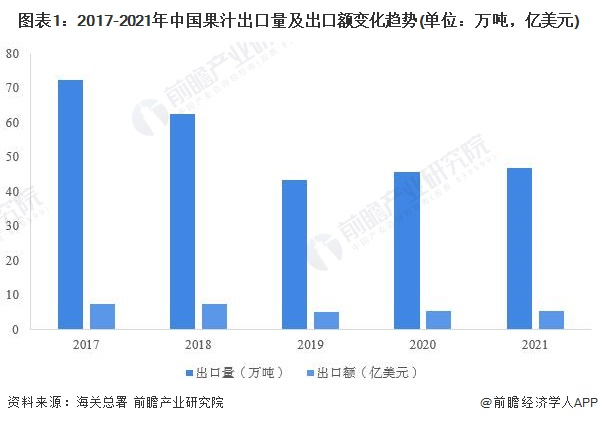出口方面,2017年以来,我国果汁出口呈现震荡下行走势,到2021年,我国进出口的果汁数量与金额较2020年均有小幅增加,其中,出口果汁总量为46.61万吨,出口总额为5.32亿美元,较2020年分别增加了1.08万吨和1141.44万美元,增幅分别为2.28%和2.19%。
