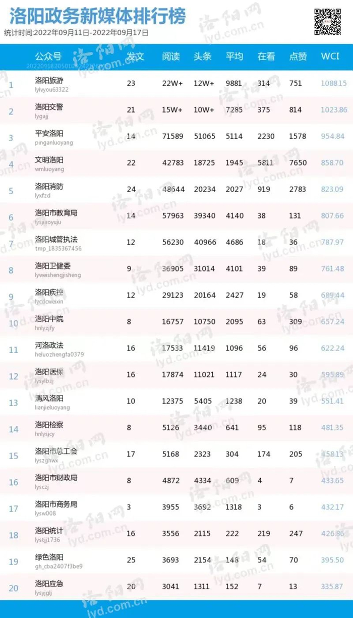 洛阳政务新媒体排行榜(9.11-9.17)