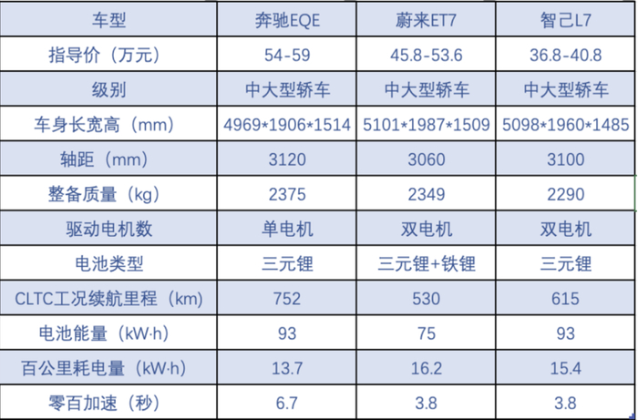 根据官方数据,EQE 350的锂电池可用能量约为96.1千瓦时,在WLTP和CLTC工况下续航里程分别可达654公里和752公里。作为EQE的主要竞品,智己L7和蔚来ET7的续航总里程均不敌EQE。