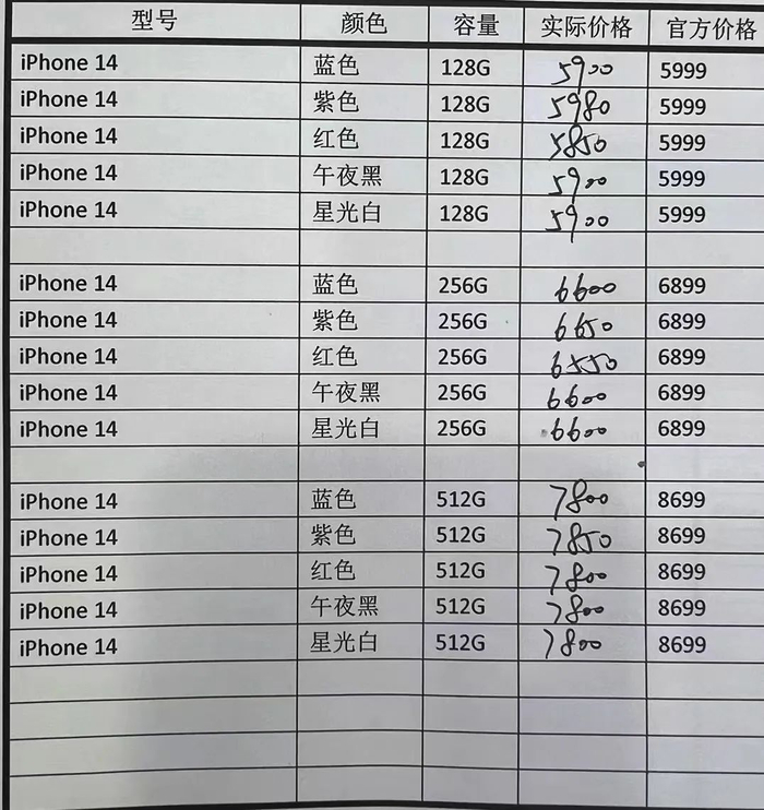 9月16日首销日,记者从上述经销商处获得的报价单便显示,iPhone 14 512G版本已经破发,官方价8699元,该经销商给出的报价是8300元。随后两天,iPhone 14价格继续下探,128G和256G版本也相继破发。该经销商今日给出的报价显示,iPhone 14 512G版本已经跌至7800元,比官方价格低了899元,128G和256G版本也比官方价格低100元-300元不等。