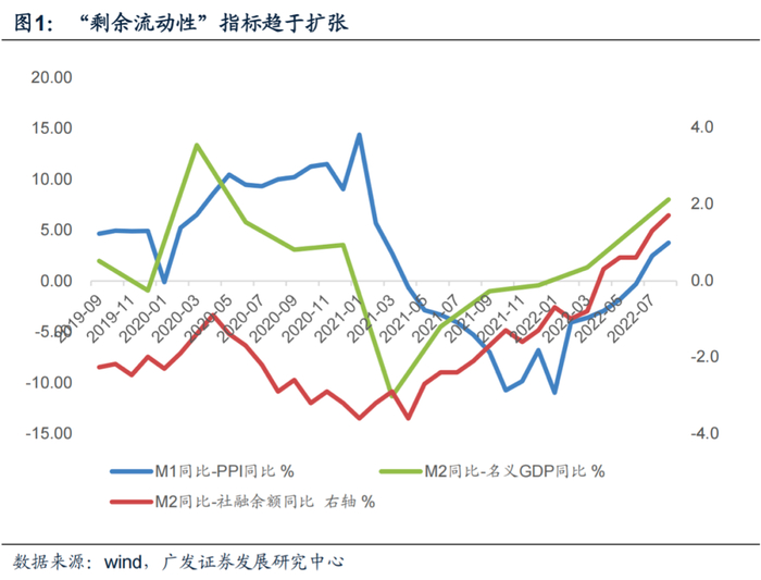 今年用后两种方法度量的“剩余流动性”都出现了明显改善。M1同比-PPI同比从2021年末的-6.8%升至2022年8月份的3.75%,M2同比-名义GDP同比从2021年末的-0.4%升至2022年二季度的8.0%,M2-社融从2021年末的-1.3%升至2022年8月份的1.7%。