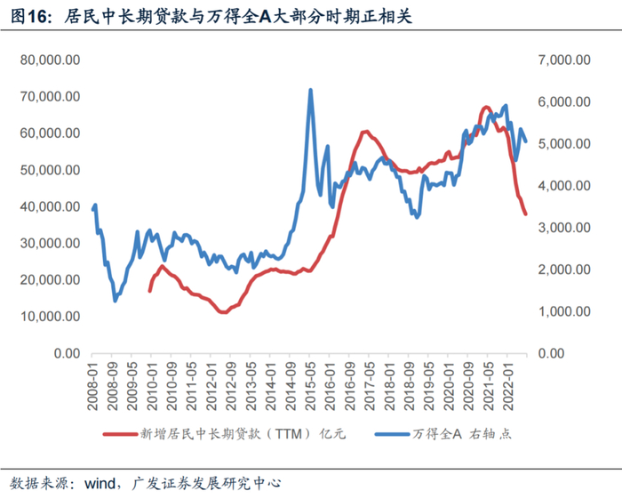 既然货币供给与“剩余流动性”对资产价格的指引作用减弱,那么在流动性领域我们该关注哪些变量?我们认为本轮我们可以重点关注两个变量:一是居民中长期贷款,它的变化会映射地产与投资者对分子盈利预期的变化,经验上与万得全A趋势基本相近(除2015年外);二是非银存款,它包括了广义基金的存款、证券公司交易保证金等,是宏观领域最接近金融市场流动性的指标,经验上其趋势变化与万得全A亦有一定的相关性。
