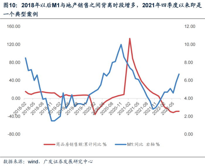 而货币供给M1之所以会对资产价格有一定的指引价值,主要逻辑在于:M1变化很多时期都是由地产销售驱动的,地产销售一则会带来居民存款向企业存款的转移,二则作为大额消费,居民往往需要贷款,这会创造出相应的货币,变成企业存款;地产销售在很多时期又是经济表现的“晴雨表”,是国内增长的重要驱动力。所以当货币供给M1改善时,往往背后伴随着地产销售改善,新一轮地产周期启动,经济在地产周期的带动下可能走出衰退走向复苏,投资者基于这一点,会提前入场做复苏交易,从而推升股票价格。