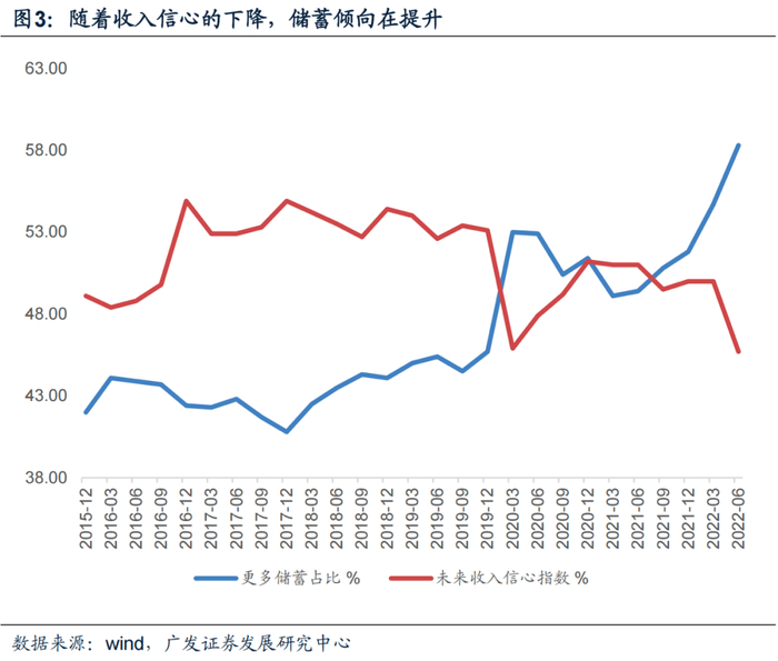 这一点有两个数据事实可以验证:一是居民的储蓄倾向与居民对未来收入预期明显负相关,我们以央行调查问卷报告中的“更多储蓄占比”作为储蓄倾向的代理变量,以“未来收入信心指数”作为收入预期的代理变量,会发现两者走势相反,2019年末至今,未来收入信心指数从53.1%降至45.7%,而“更多储蓄占比”从45.7%升至58.3%。