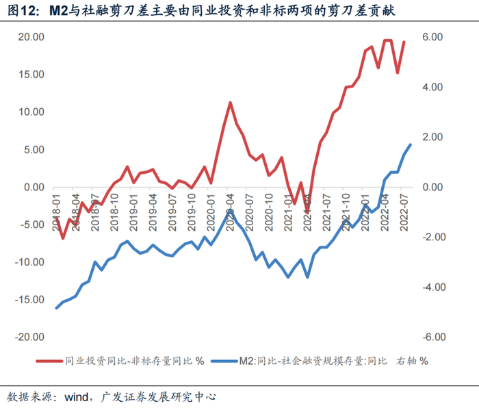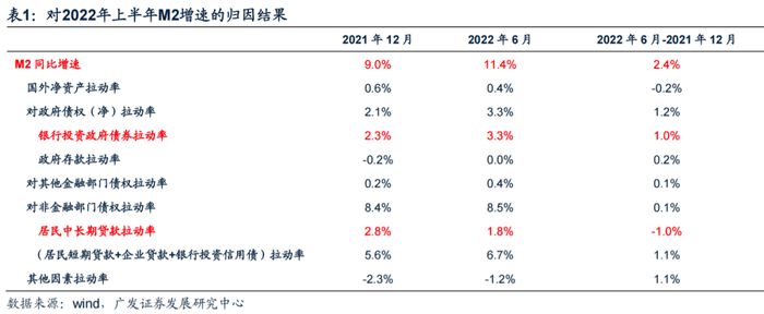 今年上半年,M2同比增速为11.4%,较2021年末提升了2.4个点。从资产端对M2增速进行归因,我们会发现: