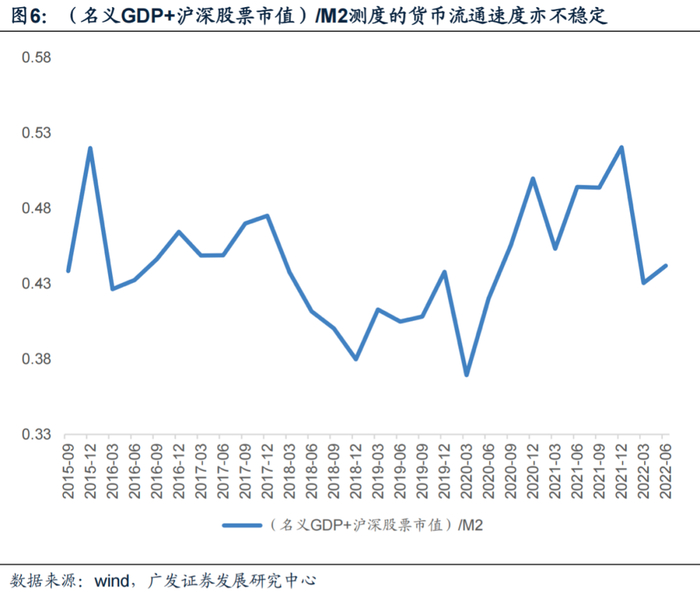 无论是直接用名义GDP/M2,还是考虑金融资产后的(名义GDP+沪深股票市值)/M2,最后我们所得到的货币流通速度V都是不稳定的。