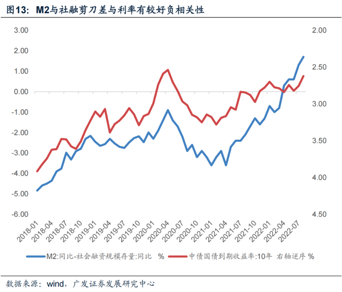 从宏观视角粗略来看,M2代表的金融机构负债端,社融代表的是金融机构资产端,两者的剪刀差代表的是金融机构资产负债的相对变化,如果M2同比-社融余额同比的剪刀差走阔,也就意味着金融机构负债端较为充裕,但资产端较为缺乏,金融机构出现了结构性资产荒,此时利率往往趋于下行。