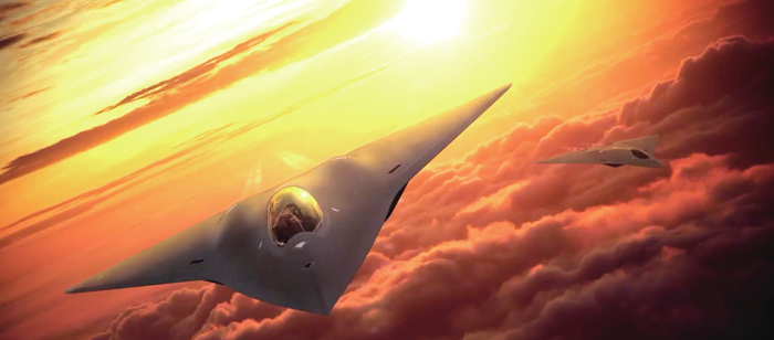 2.穿透性制空战斗机穿透性制空战斗机执行对穿透性轰炸机的护航和防区内作战区域肃清空域任务,必要时配合穿透性电子战飞机实施电磁干扰,是遂行进攻性制空作战任务保证穿透打击完成的关键。作战时可利用全向宽频综合隐身能力穿越敌方防空系统,利用先进传感器担当信息节点,完成火控信息“穿透”。穿透性制空战斗机具有比F-22战斗机更大的航程和载弹量,更好的隐身性能和更先进的传感器。根据开源信息,穿透性制空战斗机雷达截面积预计将比F-22降低一个数量级,作战半径超过1800千米,采用自适应变循环发动机技术,可将发动机燃油效率提升25%,最大速度可达马赫数2.5,同时推进的全机能量综合优化能力,将解决未来多电战斗机功率和热能管理问题,保证更大功率的任务传感器、机动系统正常使用,并将未来可能配装的高功率微波或能束武器提供支撑。