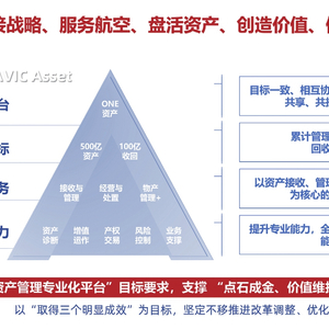 在集团公司大力支持下,中航资产:一是重点强化资产“货柜式”管理和“集装箱”吞吐,携手中国国新、中国东方构建专注于集团改革调整类资产的航新资产接收平台+航空资产调整基金“双平台”模式。二是发挥产交所席位优势,主动扩大服务范围,面向央企,集项目推介、撮合服务、在线交易、监管服务为一体的航空工业资产交易服务平台(壹资产)全功能上线。三是2021年6月设立物产事业部,提升对集团公司保障类资产集约化的经营管理水平。