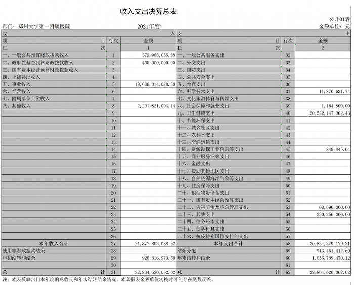 近日,有“亚洲最大医院”之称的郑州大学第一附属医院(下简称郑大一附院)在官网公布了其2021年度单位决算数据。报表显示,郑大一附院2021年收入合计218.78亿元,合计支出为208.34亿元,与上年度相比,收、支总计增长13.04%;年初结转和结余为9.27亿元,年末结转和结余10.56亿元。