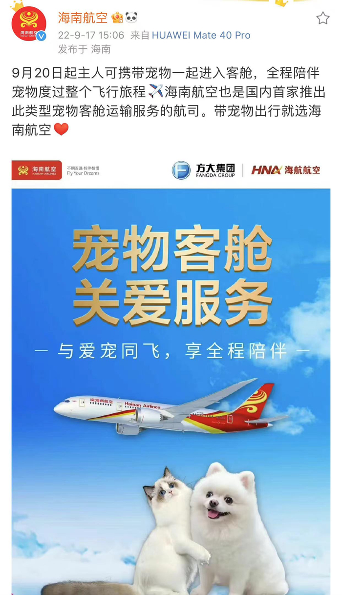 9月20日,海南航空推出了“宠物客舱”关爱服务,旅客可以携带宠物一起进入客舱。具体内容可查阅海南航空微博及官方网站。   微博@海南航空  图