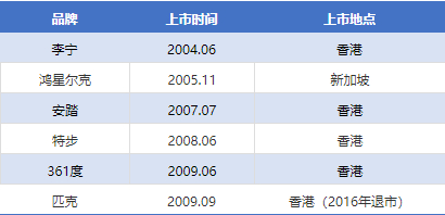 在安踏的带动下,其他晋江鞋企也纷纷上市募资,其中特步、361度、匹克在香港上市,喜得龙在新加坡上市。有了资本后,中国本土体育品牌进入了疯狂扩张阶段。