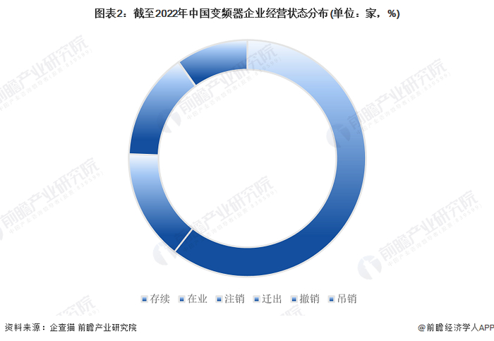 根据中国企业数据库企查猫,目前中国变频器行业的存续企业1002家,占总企业数的60%以上;在业企业数占比为15%以上;注销企业数量占总企业数的14左右%。