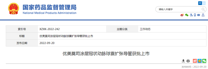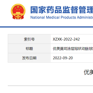 优美莫司涂层冠状动脉球囊扩张导管获批上市