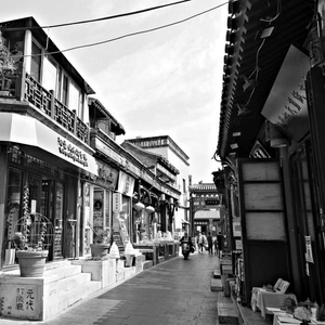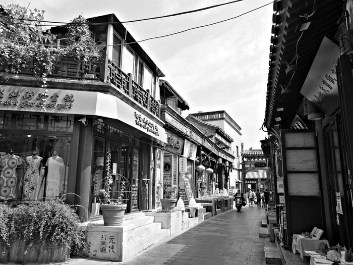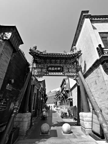 烟袋斜街东口有一座造型别致的灰色牌坊,上面镌刻着有关这条小街的几行文字。从中可知,清《乾隆京城全图》把这条长232米的小街记作鼓楼斜街,《光绪顺天府志》记为烟袋斜街,清末主要经营烟具、装裱字画和古玩玉器……可见,浓郁的市井风情以外,烟袋斜街的文化元素亦不可小觑。