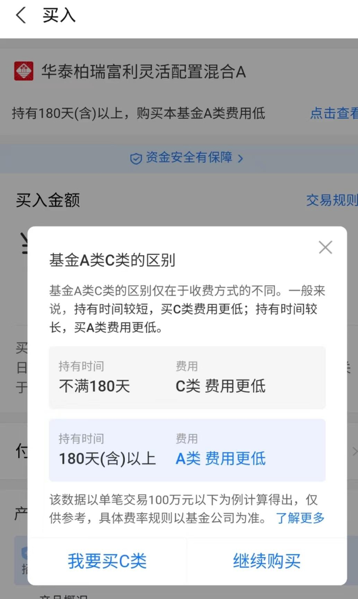 这一结论在其他基金代销平台也得到印证。支付宝基金产品购买界面明确标明A类与C类的区别,甚至建议投资者持有多少天以上,购买A类基金费用更低。以华泰柏瑞富利混合A为例,支付宝购买界面显示,不满180天,C类费用更低;180天(含)以上,A类费用更低。