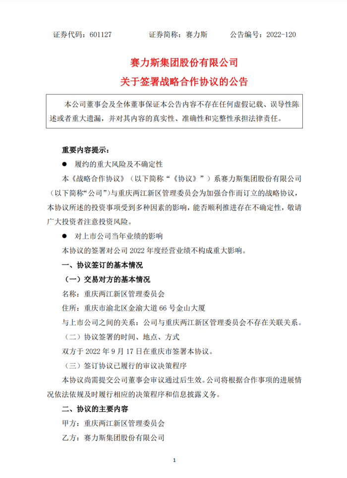 赛力斯的上涨源于一则利好消息:9月17日,赛力斯与重庆两江新区方面签订战略合作协议,赛力斯新能源汽车升级项目将落户重庆两江新区龙兴智能网联新能源汽车产业园。