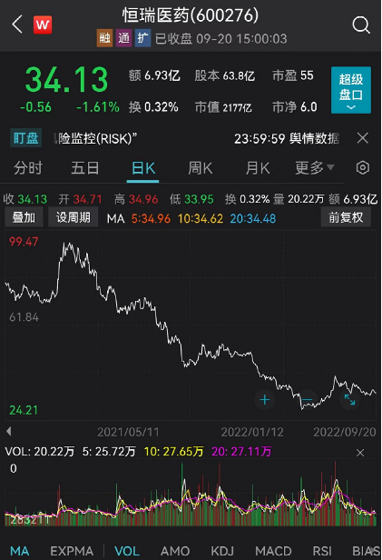 自恒瑞医药上市以来,其长期被市场视为绝对的白马股,市值一度直超4000亿,位居A股医药板块前列,并获得了“药茅”的美誉。2021年1月,恒瑞医药股价达到97元的高位,此后便一路下挫。截至9月20日收盘,恒瑞医药股价为34.13元,总市值为2177亿元。
