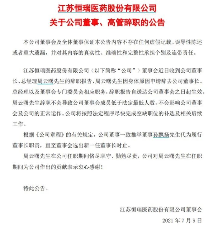 2021年7月,恒瑞医药发布公告称,其公司董事会收到周云曙的辞职报告,因身体原因申请辞去公司董事长、总经理以及董事会专门委员会相应职务。