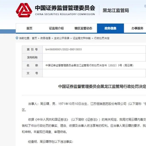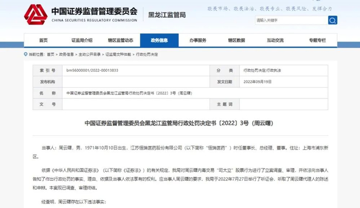 日前,黑龙江证监局网站公布行政处罚决定书显示,恒瑞医药原董事长、总经理周云曙因内幕交易被处以“没一罚一”,即没收违法所得45万,并处50万元罚款,合计罚没金额95万元。