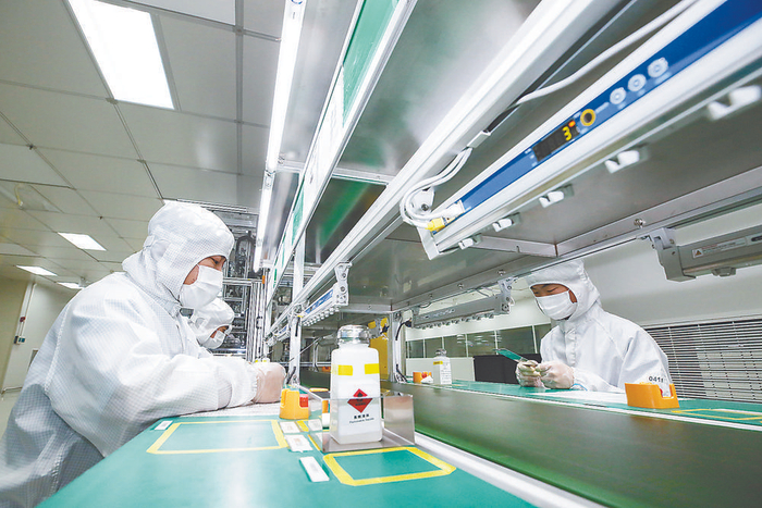 霸州市云谷电子科技有限公司生产车间内,AMOLED模组生产线工作人员对材料进行检查,以确保符合生产要求。