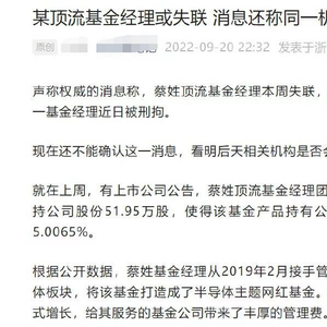 9月20日晚间,一则“蔡姓顶流基金经理本周失联”的传闻在业内广泛流传,该传闻直指诺安基金明星基金经理蔡嵩松。