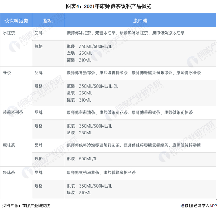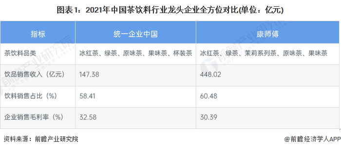 茶饮料是饮料行业中的其中一种大品类。目前茶饮料行业头部企业有统一企业中国和康师傅。通过对两家公司进行对比,可以较为直观的了解各企业的情况。两家企业均销售各类型茶饮料,包括冰红茶、绿茶、乌龙茶、果味茶、无糖纯茶等。