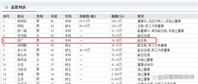 值得注意的是,据东方财富网显示,吴广的薪酬为34.08万且未持股,在六位副总裁级别中薪资排在最后。不知道这是否因为从2021年7月吴广担任副总裁开始算起。如果从2021年1月算起,那吴广的收入就有点低了,因为大部分高管都是70万元以上。