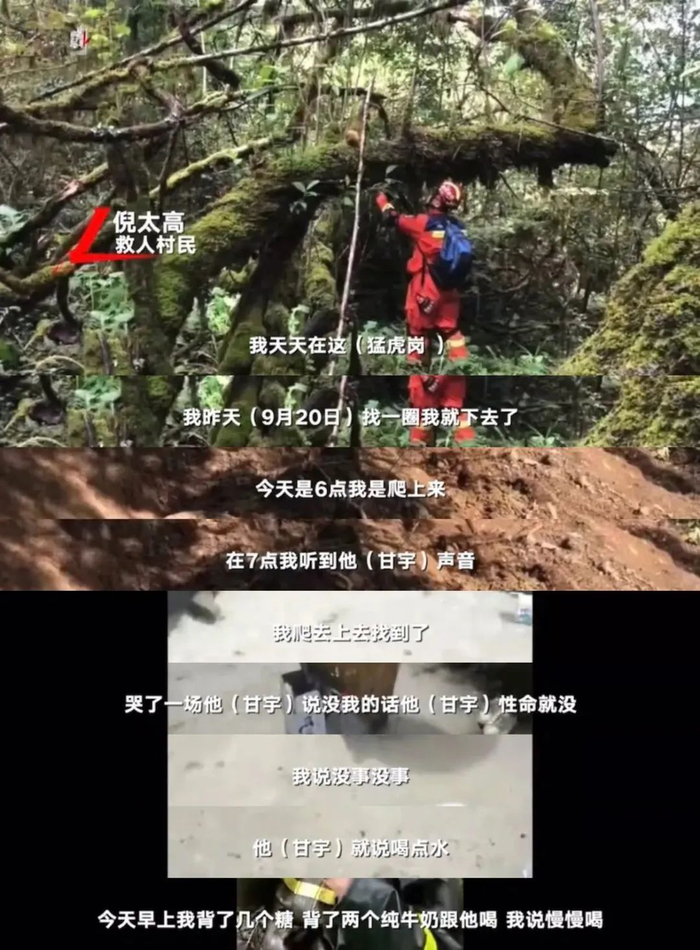 倪太高告诉新京报记者,甘宇一见到自己,就哭了起来。”倪太高连忙安慰,并拿出几颗糖和两盒纯牛奶,让他待在原地休息,又打电话给当地政府求救。倪太高看到,甘宇头发凌乱,衣服都被划破了,手脚均有擦伤,因为膝盖受伤,不能长时间站立。他打电话给妻子,让她带几件衣服上山,又叫来几位村民一起做了简易担架,让甘宇躺在担架上休息。现场视频显示,甘宇拿着牛奶的手一直在发抖。对比地震前的照片,甘宇明显消瘦不少,长出了胡子。随后,他们用担架把甘宇抬到了空旷处,等待救援的直升机。