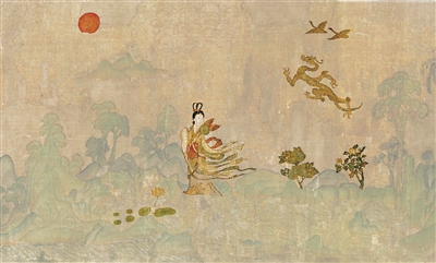 请看图四,图中那个女子就是“洛神”。请读者注意洛神所在的空间,有几种事物我们要辨认一下:空中飞行的是惊鸿和游龙,岩石中生长的是春松和秋菊,水中开放的是芙蓉,云上升起的是朝阳。这几样事物,在《洛神赋》文本中,都是用来形容洛神之美的比喻。比如,写洛神的形体是“翩若惊鸿,宛若游龙”。比如,说洛神远远看去就像“太阳升朝霞”那样皎洁明媚。可是,顾恺之却将这些比喻之词转换成了具体的形象,参与营造了洛神所处的神性空间。