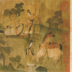 读者请看图一。这是《洛神赋图》开头的画面,画面中有两个人、三匹马,马儿们已经卸掉了重担,近处的两匹马或在吃草、或在张望,远处的那匹马却倒在了地上。以前我见到有人说,马仰面朝天,那是摔倒了。不是的,其实,那匹马是在打滚儿,驴马休息时喜欢用打滚儿的方式放松。有人说,打滚儿就打滚儿嘛,值得这么计较吗?当然值得。我们只有准确理解了细节,才能真正明白画面的意义。比如《洛神赋图》开头画这两个人、三匹马,是为什么?是为了营造一种放松的氛围。要知道,人在放松的时候,注意力不怎么集中,在这样的时刻,更容易出现走神的情况,而“走神”,对于理解《洛神赋》来说至为重要。