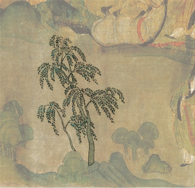 开头的画面,除了画人马,还画了一些植物。这些植物,细看很蹊跷。请看图二,那是一棵多叶树,有人认为它是柳树,有人认为它是杨树,也有人笼统称之为杨柳树。无论它是什么树,有一点可以肯定,它是一种现实中的树,因为它符合现实中树的样子。但是除了这棵多叶树,还有数量不少的另一种“树”。请看图三,你觉得它是什么树?现代学者试图给它一个准确的命名,有的说是银杏树,有的说是梧桐树,有的说是松树。古代学者没有试图判定它们是现实中的什么树,而是形容它们像什么,有人说像“孔雀扇形”,有人说像“芝栭(ér)形”。芝、栭就是灵芝与木耳。古人虽然没有明确指出它们是什么树,不过,古人的感觉是对的——孔雀也好,灵芝也好,都带着点仙气儿。实际上,这种“树”,很可能是一种仙树,或者我们可以径直称为“灵芝树”,其所对应的应该就是曹植《洛神赋》原文中的“芝田”。所谓“芝田”,就是仙人种灵芝的地方。现在,我们该追问画家为什么要画这两种树了。请读者跟我一起想,这两种树,一种是现实的树,一种是超现实的树,它们混杂在一起生长,这说明,这里就是现实与仙境的交界地带,对不对?