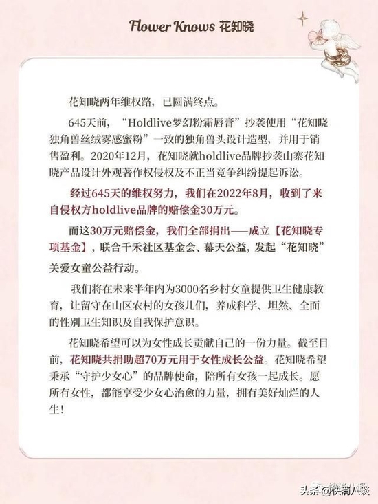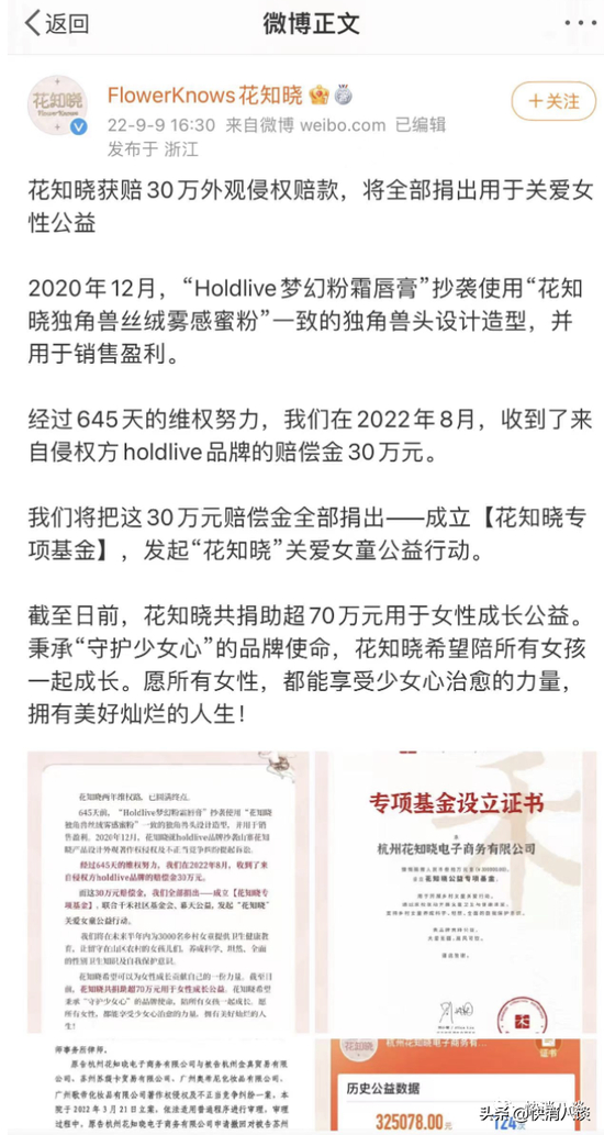 9月19日,北京商报记者获悉,国货美妆品牌花知晓长达两年的维权案件终于落下帷幕,获侵权方HOLD LIVE品牌30万元赔偿金。