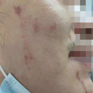 经皮肤科医生体查后发现,他面部、背部可见条带状红斑,其上可见数个不规则条带状红斑,没有明显脓性分泌物,但局部可见糜烂、少量渗出。皮肤科专家诊断,这都是隐翅虫皮炎惹的祸。