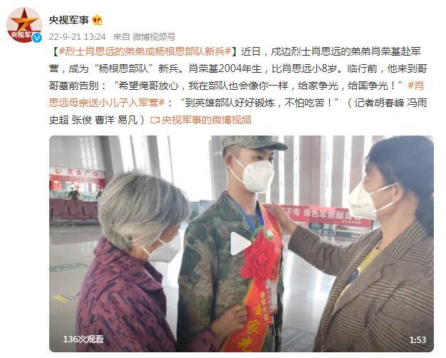 近日,戍边烈士肖思远的弟弟肖荣基赴军营,成为“杨根思部队”新兵。肖荣基2004年生,比肖思远小8岁。临行前,他来到哥哥墓前告别:“希望俺哥放心,我在部队也会像你一样,给家争光,给国争光!”肖思远母亲送小儿子入军营:“到英雄部队好好锻炼,不怕吃苦!”